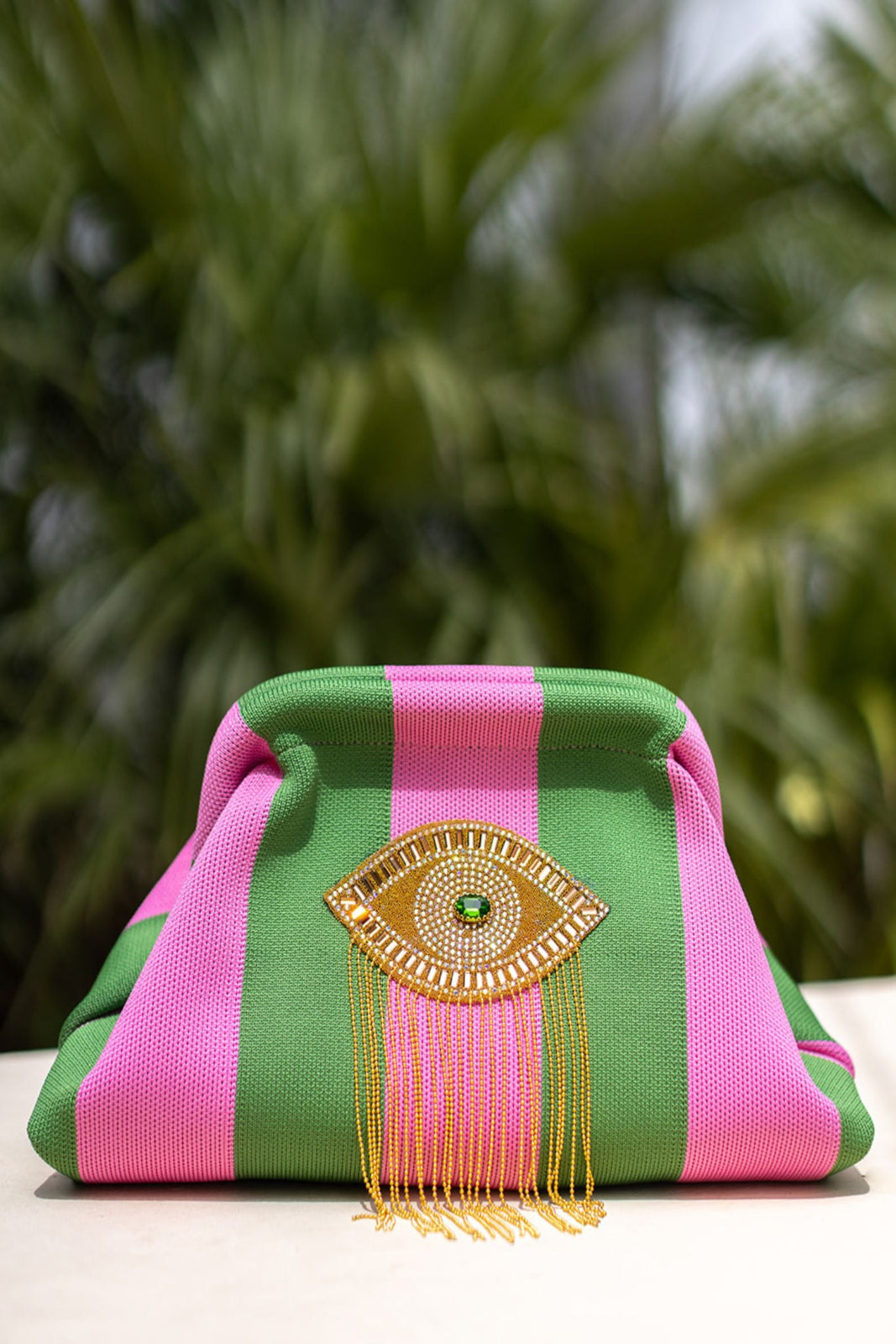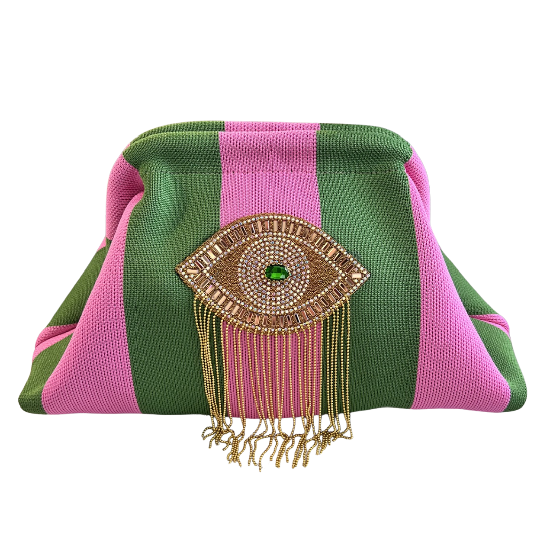 A funky hand embellished green and pink clutch with fringed eye detail and jewel centre.